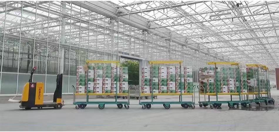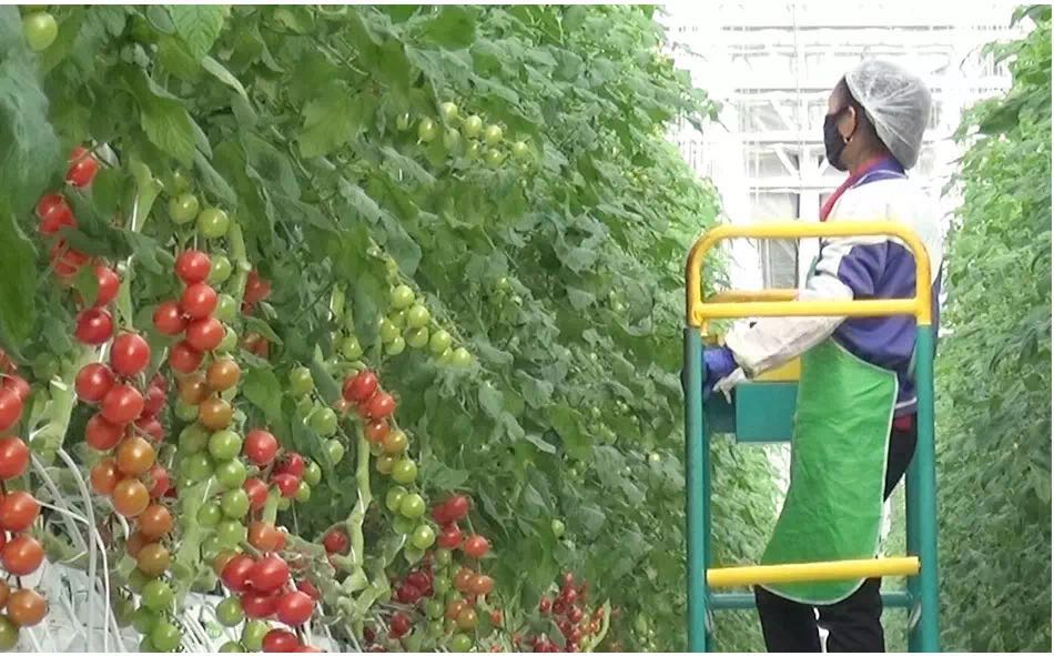 工人在種植區將成熟的西紅柿摘下來之后直接放在軌道車,電磁軌道車自動將采收好的西紅柿自動送到包裝線。