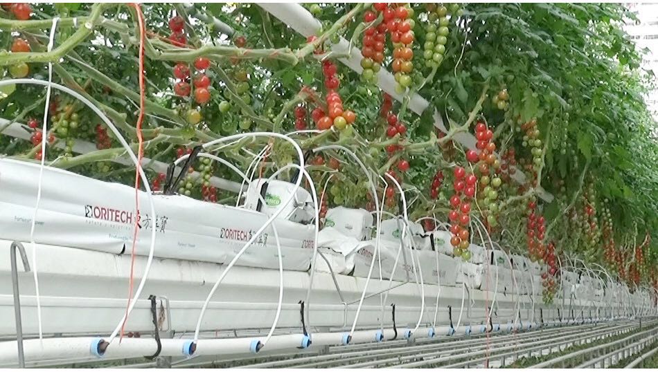 溫室內的番茄栽培一椰糠為基質,水肥一體化系統會根據西紅柿不同的生長環節精準配比出最適合生長的營養液,通過滴箭直接送到作物的根部,為西紅柿生長提供最好的營養餐,并且多余的水肥會通過回收系統消毒后再次利用。