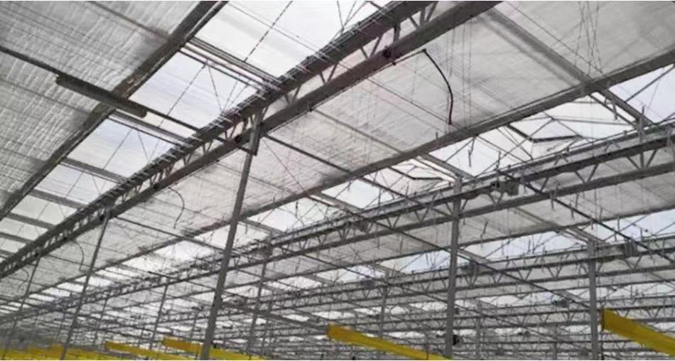 大慶項目智能溫室內使用斯文森幕布和側卷保溫系統,即1層遮陽幕布和2層保溫幕布,可根據溫室內溫度、光照、作物長勢實現自動調整。冬季時,可利用中深層地熱和天然氣鍋爐給溫室加溫,并配合雙層內保溫幕布,保證溫室番茄的正常生產。